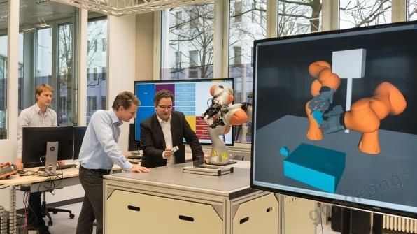 西門子——西門子中央研究院近日在慕尼黑演示了雙臂機器人的一部分,借助人工智能的高度自動化,該機器人無需編程即可自主分工協作,用于產品制造。西門子中央研究院Kai Wurm博士表示,“我們只需告訴機器人,把某個部件安裝到導軌上,它就會執(zhí)行這個操作。”作為一個簡化的例子,這項任務描述了“單件定制化生產”的內涵。其中涉及加工或組裝含有不同部件的多樣化產品。機器人從關聯的軟件模型中獲取制造產品的相關信息。傳統的機器人無法理解這種CAD/CAM(計算機輔助設計和制造)模型,但新的機器人原型可以做到。從某種意義上說,這就好像機器人能夠理解不同的語言,從而不必對其運動和工藝進行編程。