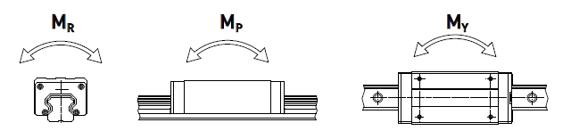 當滑塊中受到最大應力的鋼珠達到上述定義之靜額定負荷時,此時滑塊所承載之力矩稱為靜額定力矩。在直線導軌運動中是以MR、MP、MY這三個方向來定義: