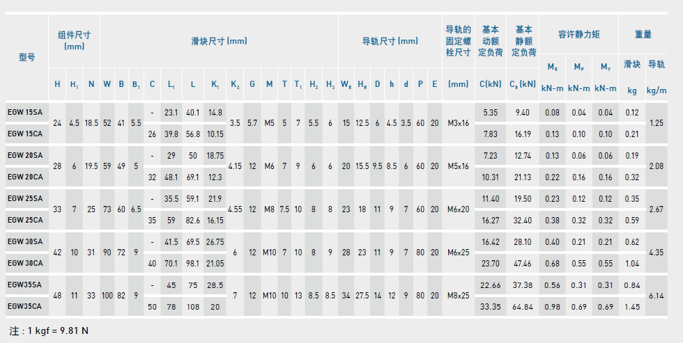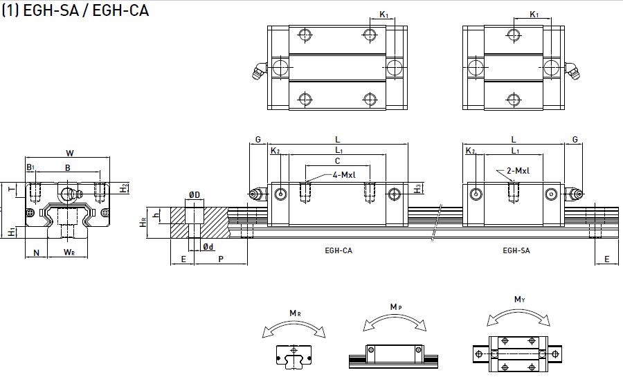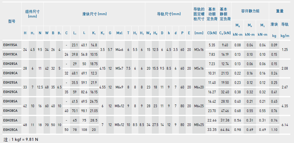 EG系列使用四列鋼珠承受負荷設計,使其具備高剛性、高負荷的特性,同時具備四方向等負載特色、及自動調心的功能, 可吸收安裝面的裝配誤差,得到高精度的訴求。 加上降低組合高度及縮短滑塊長度,非常適合高速自動化產業機械及空間要求的小型設備使用。